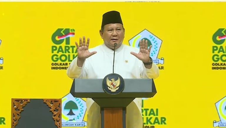 "Jadi saya sendiri condong, saya akan mengajak kekuatan politik, ayo marilah kita berani, berani memberi solusi kepada rakyat kita, demokratis tapi jangan buang-buang uang," kata Prabowo dalam puncak Hari Ulang Tahun (HUT) Partai Golkar di Istora Senayan, Gelora Bung Karno, Jakarta, Jumat (5/12/2025).