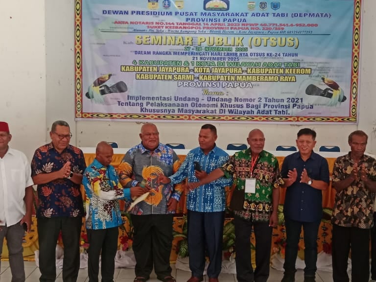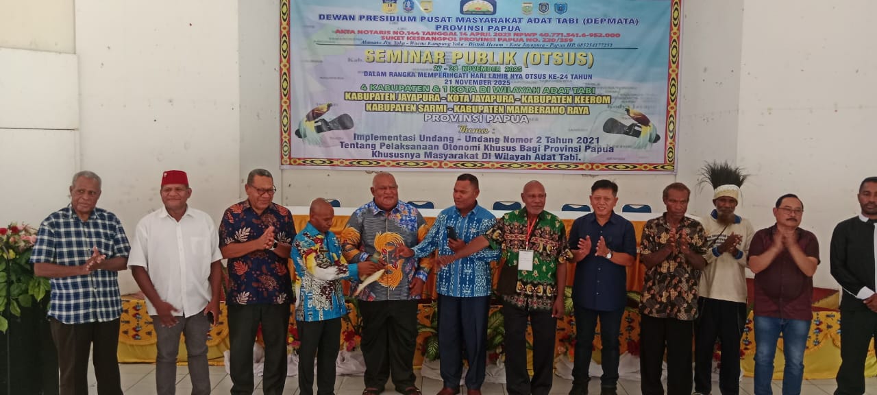 Kegiatan Seminar Publik Iplementasi 24 tahun Otsus di Tanah Papua, di hadiri oleh Staf Ahli Gubernur Papua Bidang Kemasyarakatan dan SDM Orgenes Kambuaya, Asisten I Pemkot Jayapura Evert Meraudje, Tokoh Adat, Agama, Perempuan, Pemuda di wilayah 4 Kabupaten 1 Kota di Wilayah Adat Tabi, akan berlangsung selama 2 hari yakni 27-28 November 2025(Nesta).