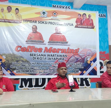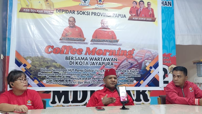 Hal ini disampaikan Ketua Depidar XXV SOKSI Papua, Willem Frans Ansanay, S.H., M.Pd, dalam kegiatan coffee morning bersama wartawan di Sekretariat SOKSI Papua, Kota Jayapura, Kamis (30/1-/2025) yang digagas oleh Wakil Ketua Bidang Informasi dan Komunikasi Depidar XXV SOKSI Papua, Hendrik Yance Udam, bersama Sekretaris Simon Latue dan Wakil Bendahara, Indiri Roring.